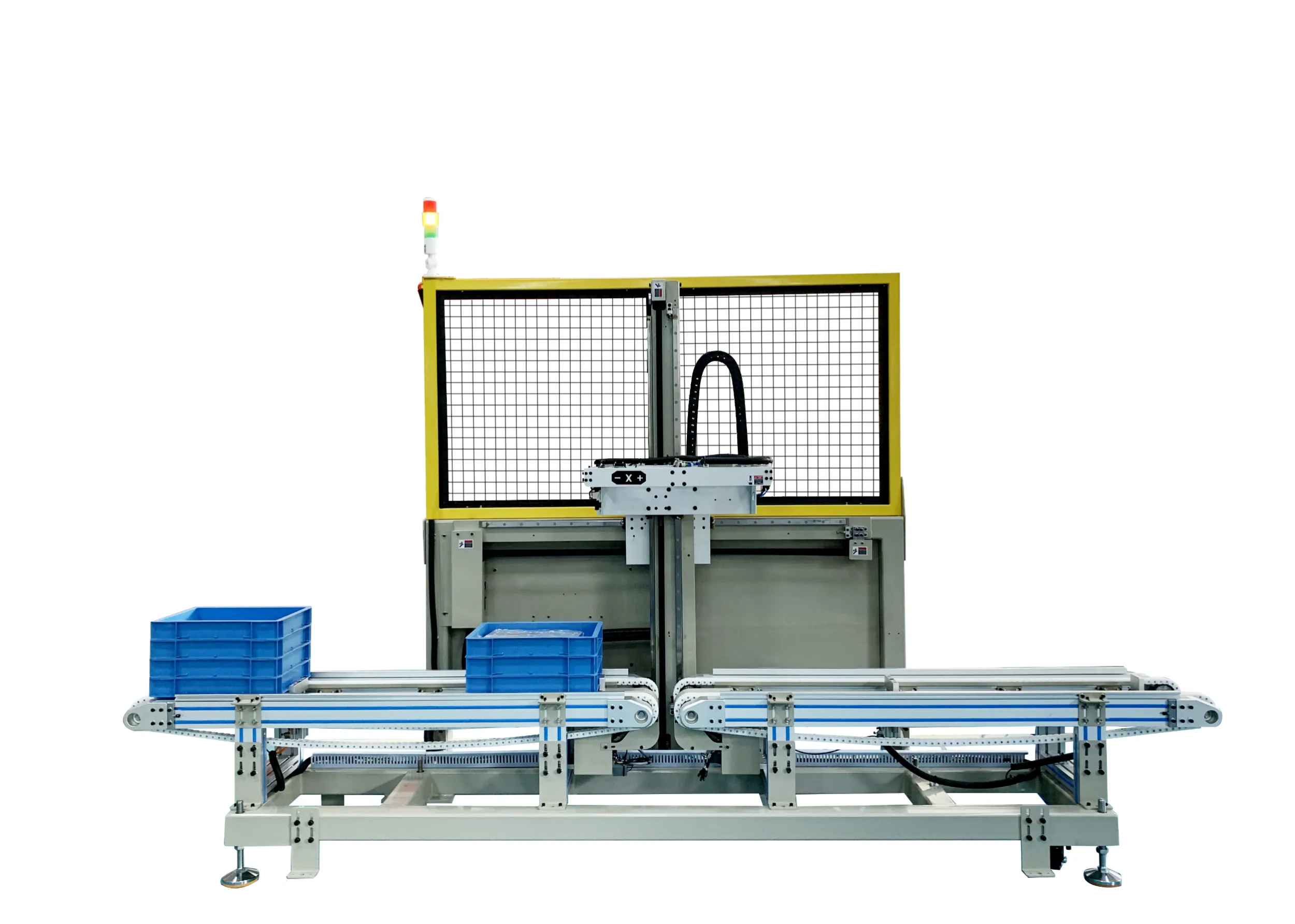 特点:设备AC伺服马达驱动,能与注塑机 CNC五金加工机联机,实现柔性全自动化生产:设备采用模块化设计,搭配灵活性高与MES系统实现生产数据实时上传、即时掌握生产状态;可对接AGV实现自动上下料功能,减少人力、物流成本;采用标准通用胶箱,实现自动上下料,储存时间长,成本低;通过ZIONEX五轴伺服机械手实现自动上下料功能。 应用:适用于汽车、家电、医疗、手机、五金、智能穿戴等行业的注塑成型 CNC精密加工产品装箱功能。